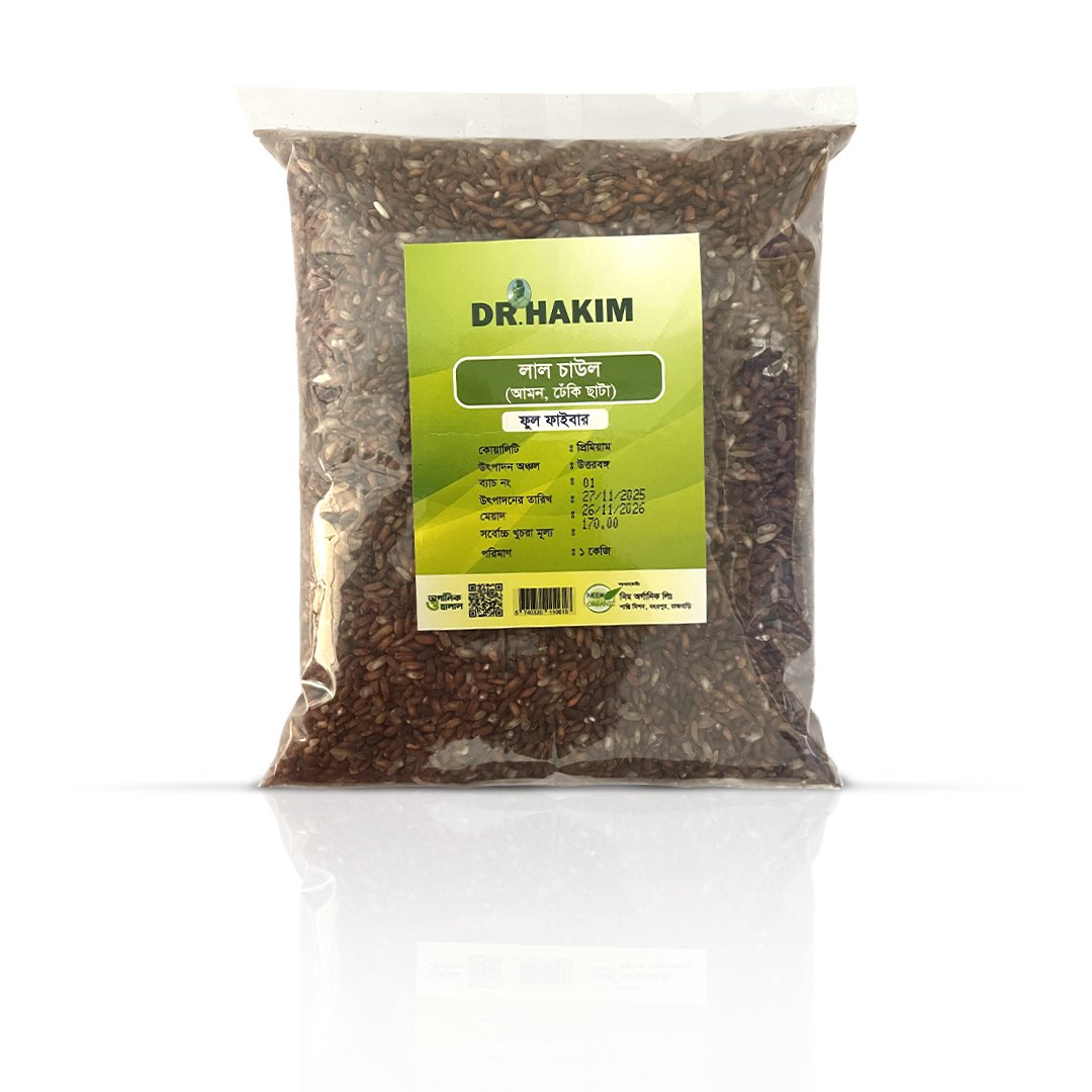 DR. HAKIM লাল চাউল (আমন, টেঁকি ছাঁটা) নির্বাচিত উৎকৃষ্ট মানের ধান থেকে ঐতিহ্যবাহী টেঁকি ছাঁটা পদ্ধতিতে প্রস্তুত করা হয়েছে, যাতে চাউলের প্রাকৃতিক পুষ্টিগুণ ও ফাইবার অক্ষুণ্ণ থাকে। এই লাল চাউলে ফাইবার বেশি থাকায় এটি হজমে সহায়ক এবং দীর্ঘ সময় পেট ভরা অনুভূতি দেয়। নিয়মিত ভাত, খিচুড়ি বা ডায়েটভিত্তিক খাবারের জন্য এটি অত্যন্ত উপযোগী। কোনো কৃত্রিম রং বা ক্ষতিকর উপাদান ছাড়া স্বাস্থ্যসম্মতভাবে প্যাকেটজাত এই চাউল একটি নিরাপদ ও নির্ভরযোগ্য খাদ্যপণ্য।